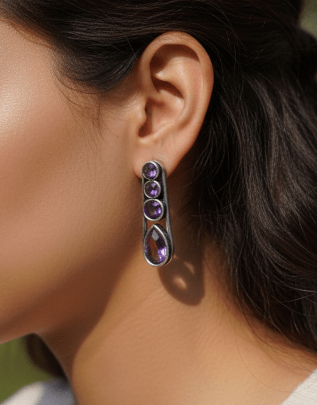 These striking drop earrings feature a sophisticated vertical design, blending old-world charm with a modern silhouette. Crafted with a polished silver-tone finish, the frame houses four beautifully graduated purple gemstones. Starting with three delicate circular stones and culminating in a bold, teardrop-shaped focal point, these earrings are designed to catch the light and frame the face perfectly.