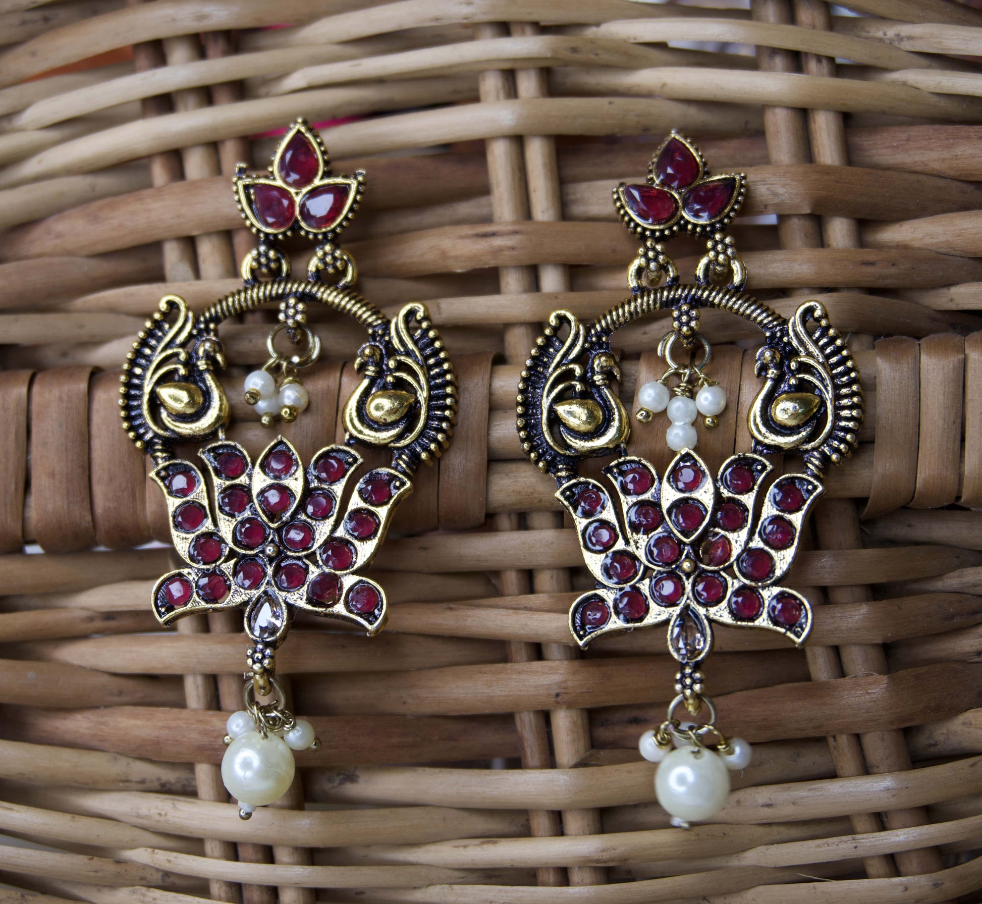 Embrace traditional elegance with these Antique Temple Earrings, crafted with intricate detailing and adorned with ruby-red and emerald-green stones. The gold-toned design exudes a regal charm, while the delicate pearl drop adds a graceful finishing touch. Perfect for festive occasions, weddings, and cultural celebrations, these earrings beautifully complement sarees and ethnic outfits, giving you a timeless, royal look.
