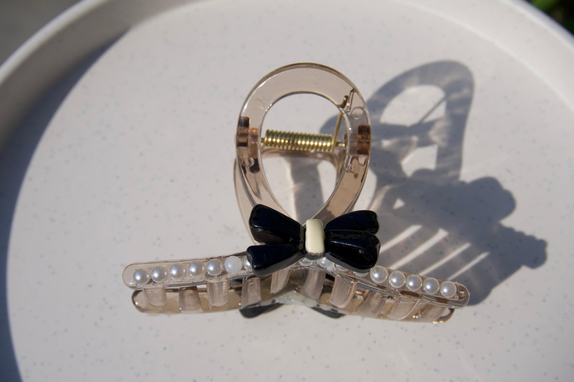 Add a touch of effortless elegance to your everyday hairstyle with this Pearl Bow Hair Claw Clip. Crafted from premium transparent acrylic, this chic clip features a classic black bow accented with delicate pearl detailing for a refined, feminine look.
