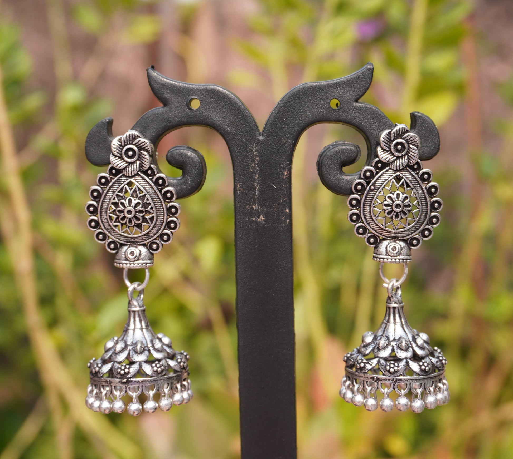 Discover these stunning oxidized silver jhumka earrings. Featuring an intricate floral dome and tiny hanging ghungroo bells. Small size, perfect for traditional and fusion looks.