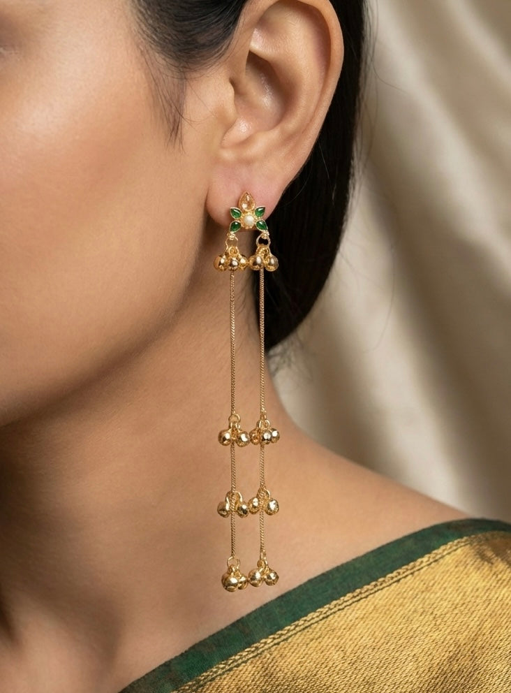 The focal point is a dainty, flower-shaped stud featuring vibrant green stone petals and a central shimmering pearl. Suspended from this garden-inspired base are two extra-long, delicate gold-tone chains. Each chain is accented with multiple miniature golden bells (ghungroos) that create a soft, melodic shimmer as you move.