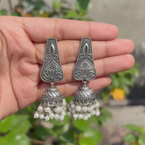 Make a divine statement with these elegant Lotus Jhumkas. Crafted in rich, oxidized silver, the detailed lotus panel connects seamlessly to a dramatically tiered base adorned with cascading pearl drops. The combination of the antique silver texture and the soft movement of the pearls creates an unmatched sense of grace. Ideal for weddings, cultural events, or when you want your jewelry to speak volumes. Intricate design meets timeless elegance.