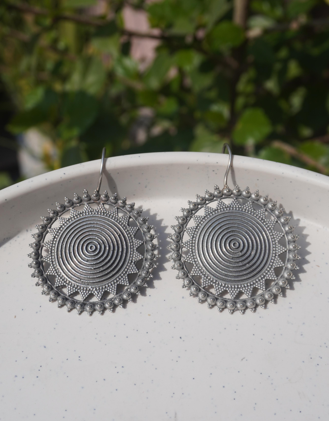 Inspired by traditional tribal motifs and celestial symbols, these earrings feature an intricate, multi-layered spiral center framed by a delicate sunburst serrated edge.