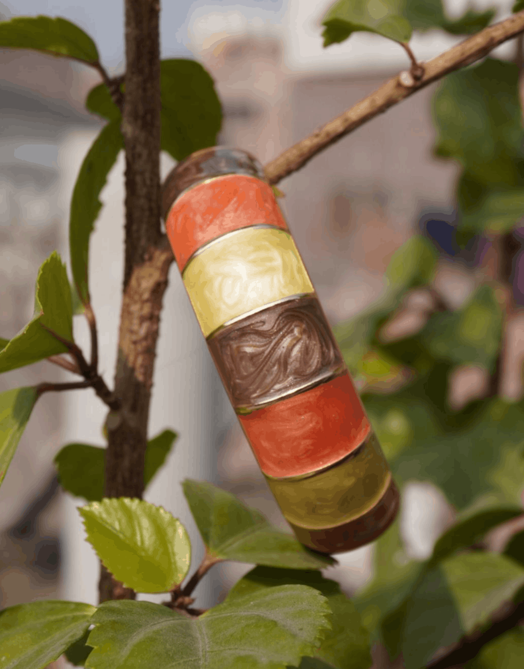 This chunky bangle features a sophisticated blend of warm coral, soft butter-yellow, and marbled mauve-grey panels. Each rounded cabochon is set within a polished gold-tone frame, creating a seamless, high-end finish that bridges the gap between vintage "mod" style and contemporary elegance.