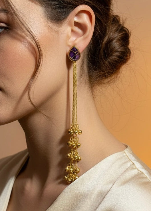 The earring begins with a beautiful tear-drop shaped stud featuring a deep, rich purple gemstone (resembling Amethyst or colored glass/Kundan work). This elegant stud anchors a magnificent cascade of multiple, finely crafted gold-toned chains that drop dramatically down the neck. The chains are accented at the bottom with clusters of traditional Ghungroo (tiny metal bells), adding subtle movement and a luxurious texture.