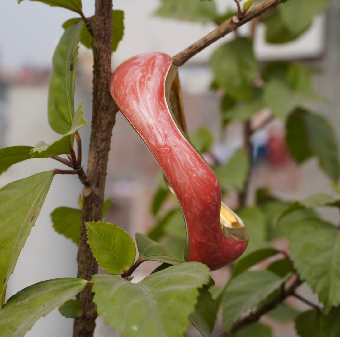 Make a subtle yet striking statement with this pearl white sculpted kada bracelet. Designed with an organic wave form and finished with polished gold detailing, this piece reflects modern artistry with timeless appeal. The smooth enamel texture adds a luxe touch while ensuring comfortable wear throughout the day. Style it solo for a refined look or stack it for a bold fashion moment—perfect for festive wear, evening outings, or elevated everyday styling.