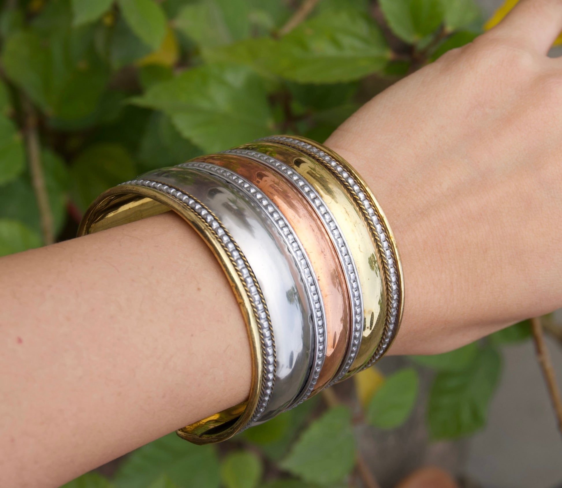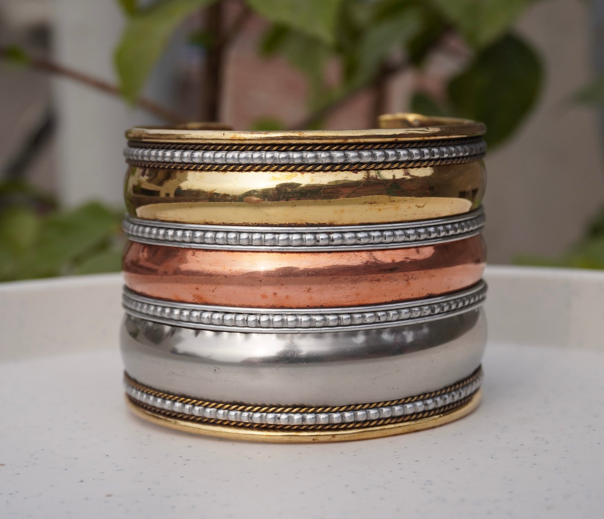 Elevate your style with this stunning tri-tone statement cuff bracelet, featuring elegant layers of gold, silver, and rose-gold finishes. Designed with subtle textured detailing along the edges, this bracelet blends classic charm with a modern luxe appeal. Its bold yet versatile design makes it perfect for everyday wear, office styling, or festive occasions. Wear it solo for a refined look or stack it with bangles for a dramatic statement.